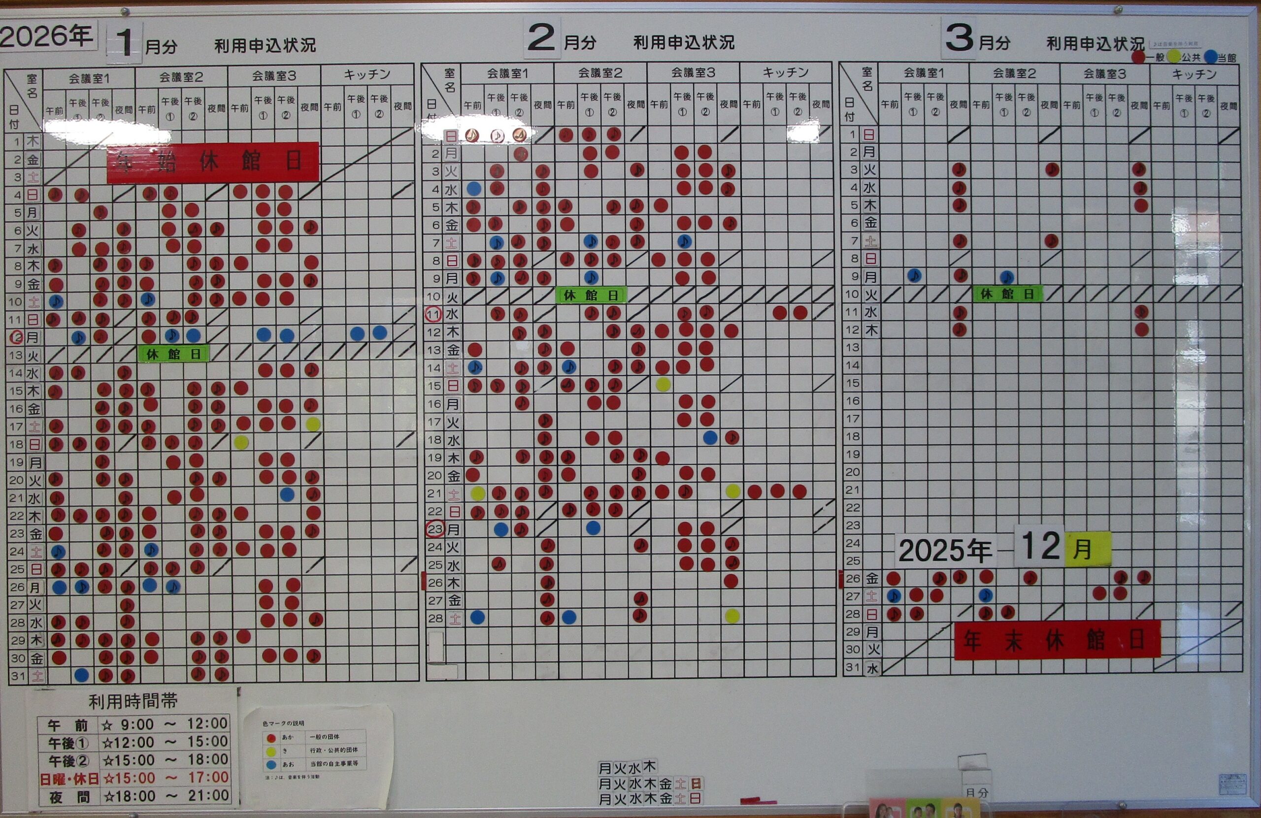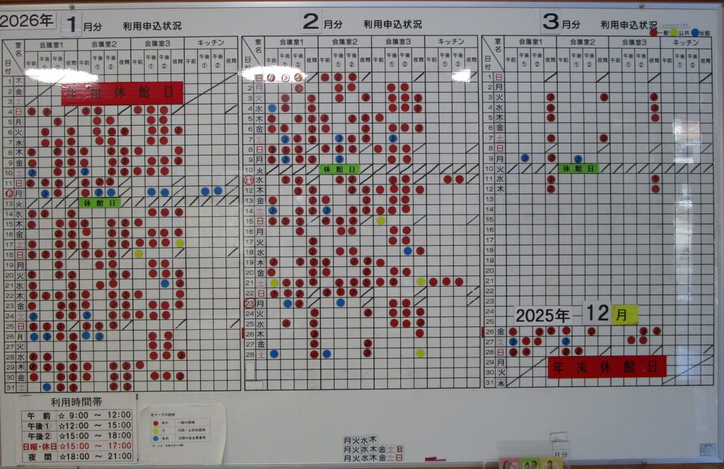 *館内の「利用申し込み状況ボード」の写真です。更新日時:12月26日(金曜日)13時00分